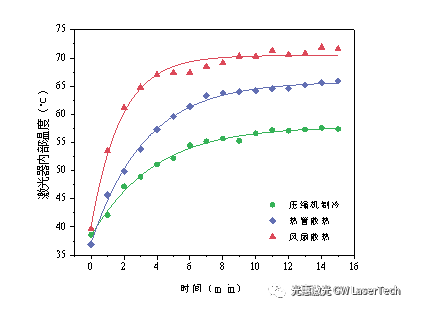 ▲ 不同風冷方案激光器輸出1.5kW激光時溫度隨時間的變化(實驗室數據,與(yu) 實際現場使用可能存在偏差)