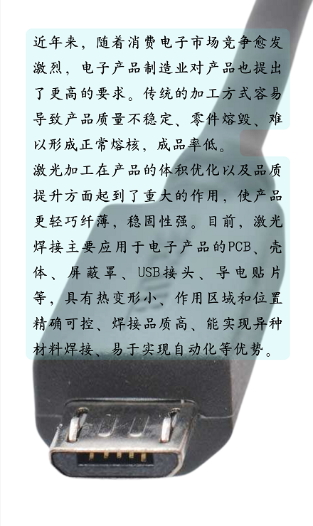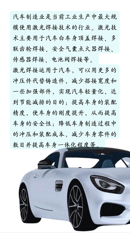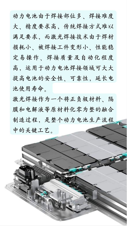 在高端市場上滿足下遊廠商對於(yu) 自動化、安全性、精密性、產(chan) 品良率、加工效率等的需求,具有傳(chuan) 統焊接工藝無法企及的焊接效果,多用於(yu) 動力電池、汽車、消費電子行業(ye) 。