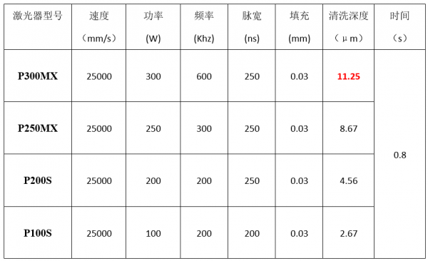二、工藝實測:旗幟P300MX脈衝(chong) 激光器在極柱清洗上的應用 旗幟係列P300MX脈衝(chong) 激光器在極柱表麵清洗測試對比 表3 F254場鏡下旗幟係列清洗效果圖 如表3所示,四款激光器在其最佳光學參數條件下清洗後樣件照片,樣色依次由深入淺,樣件清洗深度也逐漸降低。因為(wei) 光斑搭接率的減小,其它三款激光器清洗後樣件表麵出現明顯的激光掃描痕跡,而P300MX激光器的高平均功率和光束質量使其可以在保證光斑搭接率的同時獲得更大數值的單光斑能量密度,從(cong) 而提高清洗效率和清洗深度。