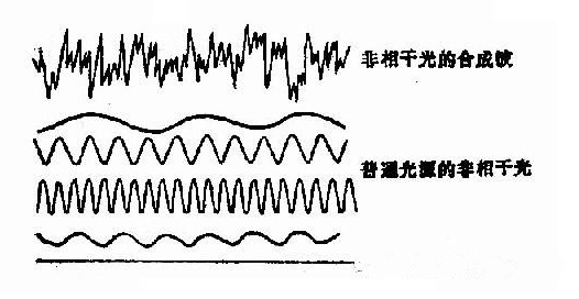 一般光源發射出來的光是非相幹光,它是波長不等、雜亂(luan) 無序的混合光束。由於(yu) 非相幹光的波長、相位、振幅極不一致。因此它們(men) 的合成波也是一條雜亂(luan) 無章、毫無規律的曲線(圖4-26-1),從(cong) 中不易找出它的周期性來。普通光源如日光、燈光等所輻射的就是這非相幹光線。