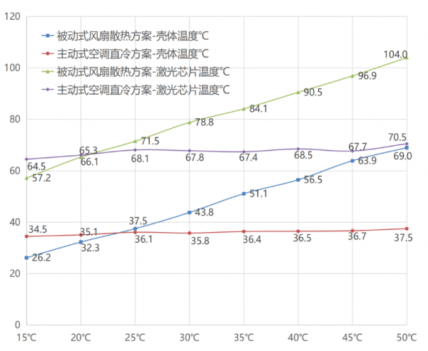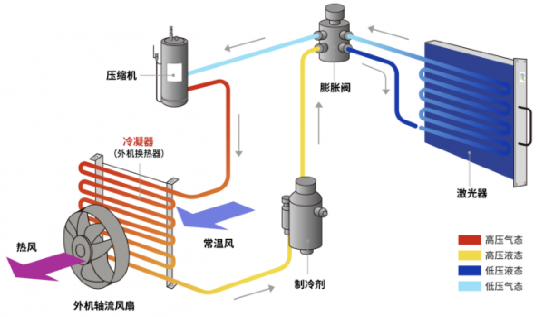 02\強製風冷 VS 空調直冷 首先我們(men) 先來了解一下強製風冷的散熱方式在手持激光焊機中的優(you) 缺點; 優(you) 勢:強製風冷技術是通過將熱量傳(chuan) 導的形式,將所產(chan) 生的熱量傳(chuan) 導至鋁製散熱器,通過風扇吹動環境空氣快速流動,從(cong) 而實現對散熱器的自然換熱。相比於(yu) 水冷散熱技術,風冷散熱不需要額外配備水冷箱,可以減少設備數量和體(ti) 積。 劣勢:由於(yu) 采用自然對流的換熱方式,其散熱效率受環境溫度影響較為(wei) 明顯,在高溫環境下無法保障散熱效率,導致半導體(ti) 激光芯片升高,降低激光芯片使用壽命,無法滿足高溫環境下的持續可靠運行。 (傳(chuan) 統被動式風冷散熱方案) 為(wei) 什麽(me) 說強製風冷的散熱方式無法保障激光芯片在高溫下會(hui) 降低使用壽命,甚至失效風險? 半導體(ti) 激光芯片作為(wei) 核心元件被封裝在一個(ge) 密封的金屬殼體(ti) 中,形成一個(ge) 完整的半導體(ti) 激光泵浦,在工作中會(hui) 釋放大量的熱,如果是一台1500W的激光器滿功率運行,按照泵浦電光效率55%計算,其半導體(ti) 泵浦散熱功率大約在2100W左右,當環境溫度30攝氏度時,半導體(ti) 泵浦殼體(ti) 溫度在44攝氏度左右,此時激光芯片溫度即可達到75攝氏度以上,如果環境溫度達到35攝氏度以上,激光芯片工作溫度將高於(yu) 80攝氏度以上,麵臨(lin) 著極高的失效風險,所以對於(yu) 傳(chuan) 統強製風冷的散熱方式來說,整機2500W左右的熱量需要通過鋁製散熱器進行自然對流進行熱交換,其難度可謂巨大,加上激光芯片在高溫運行下的失效風險,無法滿足設備長期可靠的連續運行。 (與(yu) 傳(chuan) 統風冷散熱方案在不同溫度下激光芯片溫度的變化) 我們(men) 再來了解一下主動式空調直冷散熱技術在手持激光焊機中的優(you) 缺點 優(you) 勢:其原理是將空調壓縮機與(yu) 光纖激光器結合,通過空調壓縮機將氣態的製冷劑壓縮為(wei) 高溫高壓的氣態,並送至冷凝器進行冷卻,經冷卻後變成中溫高壓的液態製冷劑,中溫液態的製冷劑經膨脹閥節流降壓,變成低溫低壓的氣液混合體(ti) ,經過激光器內(nei) 部吸收熱量而汽化,變成氣態,然後再回到壓縮機繼續壓縮,繼續循環進行製冷,在製熱的時候四通閥使氟利昂在冷凝器與(yu) 蒸發器的流動方向與(yu) 製冷時相反,從(cong) 而達到製熱的效果。 劣勢:由於(yu) 采用了近似於(yu) 變頻空調的技術原理,其製造成本高於(yu) 普通散熱器的強製風冷散熱方式,其次設備重量略高。