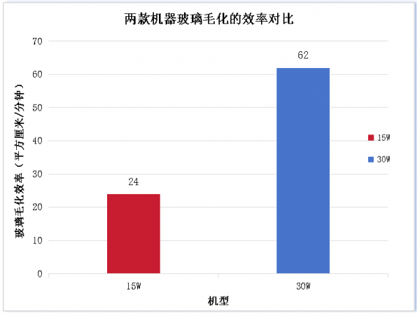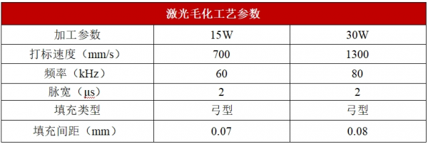 03、15w激光器與(yu) 30w激光器玻璃毛化效率對比 納秒固體(ti) 紫外的波段為(wei) 355nm,玻璃對紫外波段激光吸收率高,由於(yu) 聚焦光斑小,能量密度高,采用紫外加工玻璃毛化更加細膩。 由於(yu) 玻璃硬脆的特性,若激光能量參數控製不當,容易導致玻璃微裂紋擴展、受熱開裂或者表麵邊緣崩邊嚴(yan) 重。為(wei) 了追求不同的霧度、透光率、粗糙度以及表麵美觀效果,必須選取調整合適的激光工藝參數。
