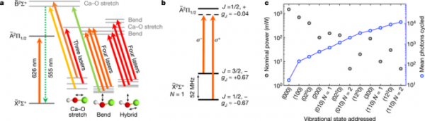 激光冷卻和再泵送方案。資料來源:Vilas, N. B., Hallas, C., Anderegg, L., Robichaud, P., Winnicki, A., Mitra, D., & Doyle, J. M. (2022),《Magneto-optical trapping and sub-Doppler cooling of a polyatomic molecule》,《Nature》。