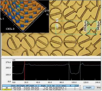 隨後使用基恩士的激光顯微鏡進行測量,結果顯示深度為(wei) 42 um。經過超聲波清洗,加工過程中產(chan) 生的汙染完全被去除。加工區域的表麵光滑度為(wei) Ra = 0.6 um,這也證明了此加工係統對要求嚴(yan) 苛的微流控應用的適用性(圖 10)。