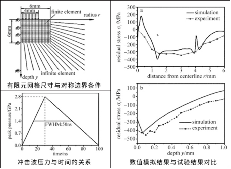 數值模擬有助於(yu) 獲得特定應用場合最優(you) 的工藝參量,已逐漸成為(wei) 研究激光衝(chong) 擊強化的重要手段。國內(nei) 外學者針對激光衝(chong) 擊強化的建模及其優(you) 化做了大量的研究工作。目前業(ye) 界在顯式動態分析+隱式靜態分析激光衝(chong) 擊強化數值模擬法,以及基於(yu) 本征應變的激光衝(chong) 擊強化數值模擬法等方麵都取得了長足進展。
