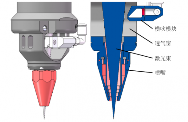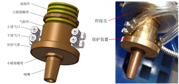 氣體(ti) 保護是影響焊接質量的一個(ge) 重要因素,良好的氣體(ti) 保護不僅(jin) 可以減少焊接飛濺,還可提高焊縫光潔度。常規同軸吹氣保護方式如圖4.1所示,焊接頭最下端安裝有一個(ge) 單層或雙層銅噴嘴,上方設置有橫吹模塊進行飛濺防護,噴嘴通過外接保護氣向焊接熔池施加保護,該方式不足之處在於(yu) 保護氣易卷入空氣,無法起到很好的氣體(ti) 保護效果。