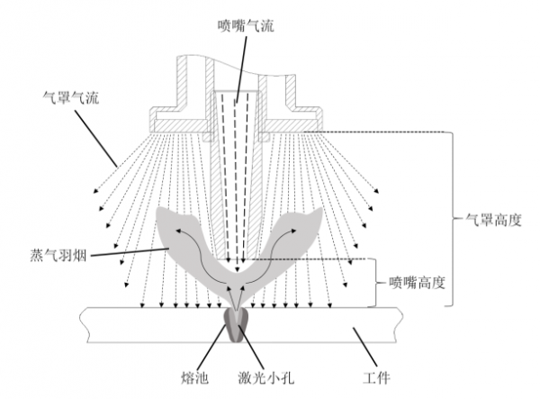 上進氣口和下進氣口均通入焊接保護氣,氣體(ti) 通入後可形成多路氣流,分別為(wei) 排空氣流、噴嘴氣流和氣罩氣流。裝置的應用原理如圖4.3所示,噴嘴氣流向下方噴射,對從(cong) 小孔中噴射出來的蒸氣羽煙在中心區域進行壓製,通過抑製蒸氣羽煙在激光束入射路徑上的噴射高度,可減少其對激光束的幹擾,提高焊縫成形的均勻性並保證焊縫熔深,同時,噴嘴氣流還可對熔池局部進行氣體(ti) 保護,噴嘴氣流壓力需適中,壓力過小則無法抑製蒸氣羽煙的高度,入射激光束受蒸氣羽煙的幹擾大,熔池及小孔穩定性差;壓力過大則會(hui) 將蒸氣羽煙壓製於(yu) 工件表麵,造成工件表麵黑色煙塵附著,影響工件清潔度,甚至造成焊縫凹陷;氣罩氣流從(cong) 較高處噴出,具有較大的噴氣麵積,可較好的排除熔池周圍的空氣,但需要注意的是,氣罩氣流壓力需適中,既要保證排空效果避免焊縫氧化過大,又要利於(yu) 蒸氣羽煙向上擴散不附著於(yu) 工件。