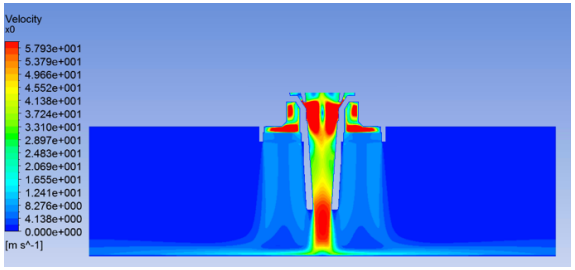 采用ansys軟件對裝置進行氣流分析,輸入較優(you) 參數進行計算,得到如圖4.4所示的氣流速度雲(yun) 圖,氣罩氣流圓周對稱,噴嘴氣流速度較高,氣罩氣流速度較低,通過內(nei) 外高低流速的配合應用,可兼顧焊接蒸氣羽煙的抑製與(yu) 擴散調節,避免工件板麵黑色煙塵附著。