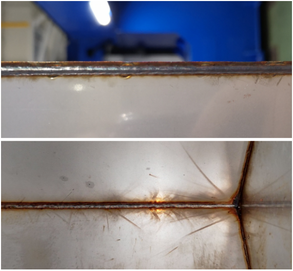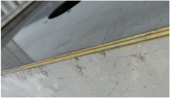 采用上述焊接設備和同軸保護裝置進行開關(guan) 櫃焊接測試,焊接效果顯著提升,焊接飛濺小,焊縫表麵光潔度好,工件板麵無明顯煙塵汙染,焊接效果對比如圖5.1~5.4所示。通過對中部噴嘴及環形氣罩的進一步匹配調節,包括高度匹配(噴嘴距工件板麵的高度以及環形氣罩距工件板麵的高度)和保護氣流量匹配(噴嘴流量以及環形氣罩流量),焊縫保護效果可達到金黃色,如圖5.5所示。