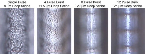 測試樣品為(wei) 340μm 厚的4H-SiC材料。利用這款雷射的可程序設計脈衝(chong) 串功能,我們(men) 使用從(cong) 單脈衝(chong) 到12個(ge) 脈衝(chong) 串的各種脈衝(chong) 配置製作了各種劃片。