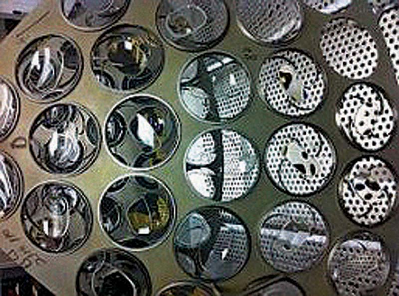 圖2:為(wei) 一種專(zhuan) 用掃描儀(yi) 定製的反射光學元件,由球形元件和非球形元件構成的陣列組成(有鍍鋁膜和未鍍膜的)。