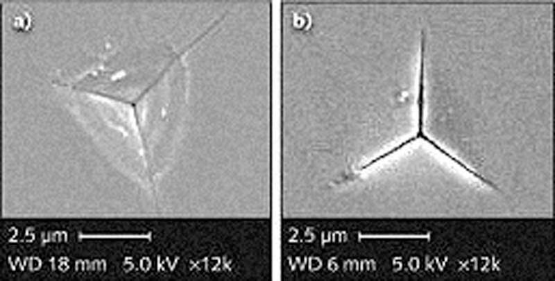 圖1:經過壓痕後,塑料光學元件上的真空鍍膜顯示出了脆性破壞(上圖a)。作為(wei) 一種替代方案,無需使用真空室的液體(ti) 聚合物納米複合材料鍍膜,經過壓痕後並沒有出現破損(上圖b)。該鍍膜可用於(yu) 反射膜或增透膜(下圖)。