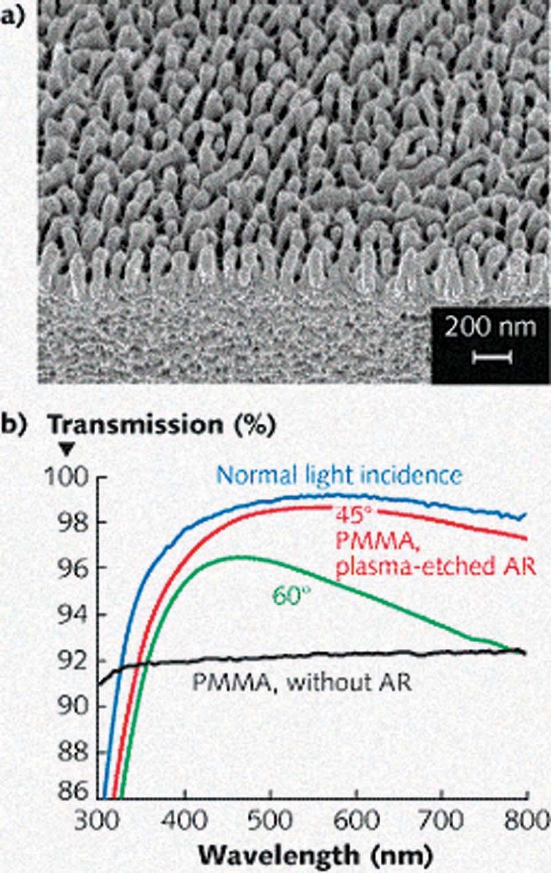 圖4:對聚合物材料如有機玻璃(PMMA)進行直接等離子體(ti) 刻蝕,創建出亞(ya) 微米級的表麵結構(a),以此作為(wei) 防反射膜(b)。