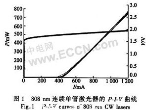 本試驗分別在40、80℃下對20隻隨機抽取的波長808 nm的無Al連續輸出功率為(wei) 1 W的單管激光器進行1.2 A恒流老化。老化前抽出10隻在室溫下進行P-I-Y測試,如圖1所示。