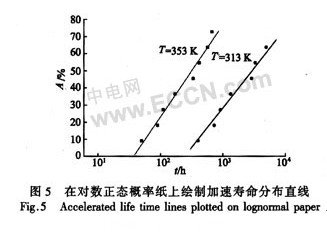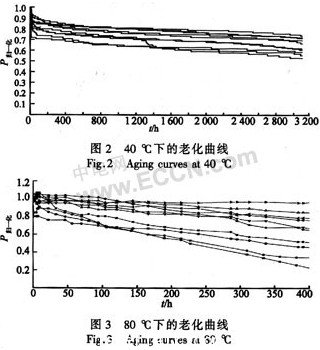 將數據代入式(2)、(3)可以解出Ea=0.52 eV/#p#分頁標題#e#K,τ=25.2(相對於(yu) 80℃)。進而,可以計算出中值壽命tm=330×25.2=8 320 h。