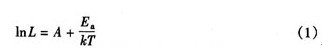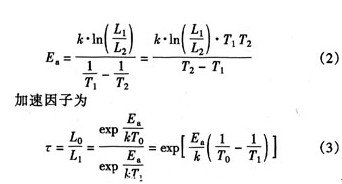 式中,L為(wei) 壽命,#p#分頁標題#e#Ea為(wei) 激活能,A為(wei) 常數,k(8.62×10-5eV/K)為(wei) 波爾茲(zi) 曼常數,T為(wei) 熱力學溫度。確定了失效模式的激活能以後,就可以得出加速係數τ。設室溫T0下壽命為(wei) L0,加速試驗中溫度T1下壽命為(wei) L1,溫度T2下的壽命為(wei) L2(T2>T1),則激活能的計算式為(wei)