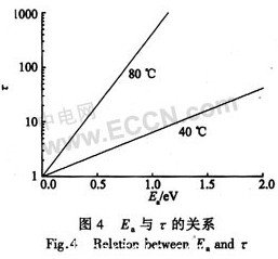 不同溫度下Ea與(yu) τ的關(guan) 係如圖4所示,不同溫度下,溫度越高,曲線斜率越大,加速效果越明顯;相同溫度下,激活能越大,加速係數越大。由於(yu) 失效機理不同,激活能也不一樣。