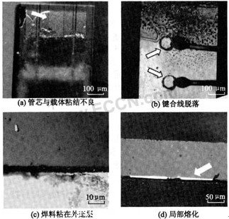 ③與(yu) 燒結有關(guan) 的退化。管芯與(yu) 載體(ti) 粘結特性不好,很容易與(yu) 載體(ti) 分離,歐姆接觸不好不僅(jin) 增加熱耗散功率而降低激光器的效率,而且會(hui) 引起局部過熱。使上述接觸電阻進一步增加,造成引線脫落等,如圖6(a)、(b)所示;另外,銦焊料過多使在加熱焊接或在後麵的加速老化試驗中焊料淹浸解理麵,而使激光器輸出功率減小或無輸出,如圖6(c)所示。