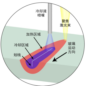CO2 和 CO 激光源加工玻璃的原理都是在局部密集加熱。具體(ti) 來說,所有玻璃都極易吸收 CO2 激光器產(chan) 生的 10.6 微米波長,因此聚焦的激光束能夠快速加熱玻璃表麵或近表麵區域。為(wei) 了實現切割效果,玻璃需要相對激光束平移,並且由玻璃上方的噴液或噴氣口對玻璃進行快速冷卻。由此帶來的熱衝(chong) 擊會(hui) 讓玻璃形成連續切縫。如果玻璃較薄,切縫可以完全穿透基板,從(cong) 而直接完成切割,這叫做“整體(ti) 切割”。如果玻璃比較厚,那麽(me) 還需要額外通過一個(ge) 激光或機械式掰斷環節才能完成切割,這叫做“激光劃線”。