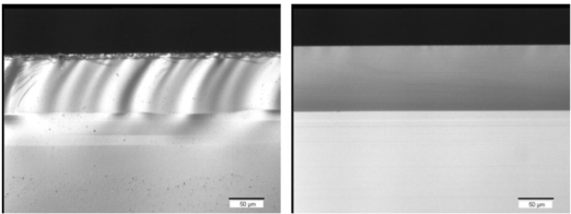 圖 1. 機械切割玻璃(左圖)與(yu) 激光切割玻璃(右圖)比較。圖中顯示,機械切割玻璃存在相當大的殘餘(yu) 應力,並且切割過程留下了大量碎屑。