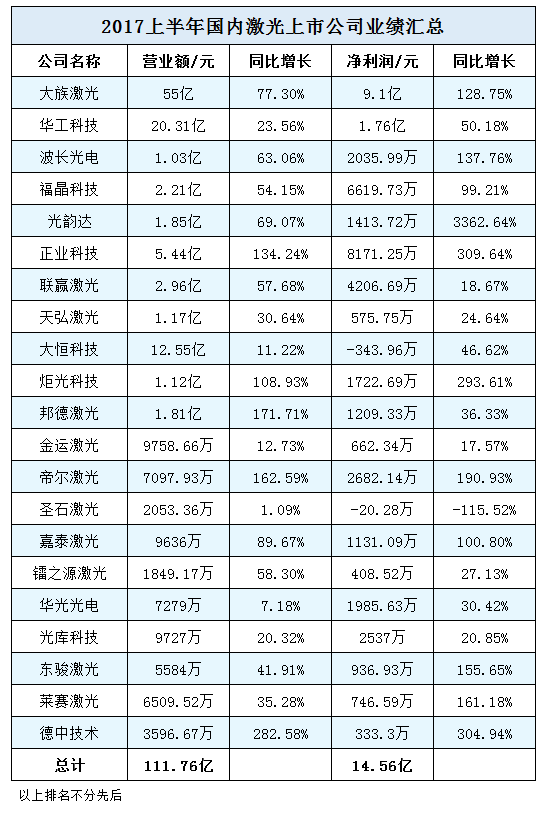 7月份以來,國內(nei) 各大激光上市公司公布2017年上半年業(ye) 績報告,fun88网页下载在此整理匯總,為(wei) 讀者一一介紹。本文提及的公司包括了在滬深主板、中小板、創業(ye) 板和新三板上市的激光相關(guan) 公司,涉及業(ye) 績總量約為(wei) 112億(yi) 元,這些公司都是國內(nei) 激光行業(ye) 出色的代表,從(cong) 它們(men) 的業(ye) 績發展情況,可以窺探國內(nei) 2017上半年激光產(chan) 業(ye) 情況與(yu) 發展趨勢,為(wei) 大家掌握目前國內(nei) 激光市場發展方向及未來趨勢提供參考。需要說明的是,本文提及的激光公司,有個(ge) 別公司業(ye) 績並不完全是激光業(ye) 務,它們(men) 還有其他非激光業(ye) 務。
