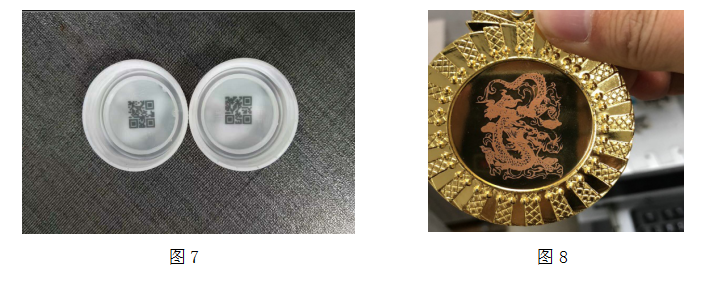 激光打標是激光加工最大的應用領域之一。激光打標的原理是利用高能量密度的激光對材料進行局部照射,使表層材料汽化或發生顏色變化的化學反應,從(cong) 而留下永久性標記。由於(yu) 大多數材料對紫外光都有較好的吸收,可以通過它對大多數材料的表麵進行精細打標,可以打出各種圖案、文字和符號等。同時打標效果的對比度較高,易於(yu) 識別。如下圖7、8所示: