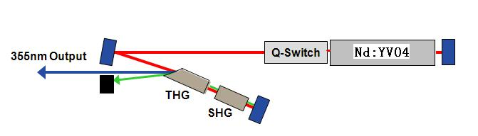 355nm激光是通過晶體(ti) 材料非線性效應的變頻技術來獲得,其原理如圖1 所示: