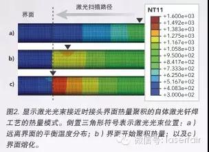 portant; word-wrap: break-word !important;">自體(ti) 激光釺焊工藝旨在最大程度降低兩(liang) 種材料的混合,因為(wei) 熔化體(ti) 積小、淬火速率高以及局部熔化焊接接頭的一端以降低金屬間脆性。局部熱量的另一個(ge) 優(you) 勢在於(yu) 能夠在混合最小的情況下以相似熔化溫度連接兩(liang) 種材料。圖2顯示了麵向金屬絲(si) 與(yu) 金屬絲(si) 界麵的激光光束掃描熱模型的溫度曲線。由於(yu) 熱量聚積,在激光光束到達界麵時,觀察到溫度增加。