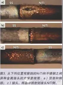 portant; word-wrap: break-word !important;"> 選擇直徑分別約為(wei) 380 µm和368 µm的NiTi和316L不鏽鋼金屬絲(si) 進行焊接實驗。NiTi和SS這兩(liang) 種材料用於(yu) 醫療設備中受到大家特別的關(guan) 注:不鏽鋼成本低且已經過生物相容性評估測試,NiTi具有超強彈性和形狀記憶特性。連接之前,將每根金屬絲(si) 的一端沿著垂直金屬絲(si) 的軸磨平並裝配到焊接夾具上。在以1064 nm波長的連續波Nd:YAG激光照射期間,使用軸向力將樣品的打磨表麵固定在一起。將高斯激光光點控製到與(yu) 金屬絲(si) 直徑相同的尺寸。將激光功率調整到最高4.75 瓦,同時將掃描速率和掃描距離分別調整在0.2–1毫米/秒和1–2.5毫米之間。在流入焊接夾具的超高純度氬氣惰性環境中進行激光連接。