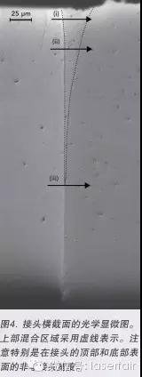 portant; word-wrap: break-word !important;"> 圖3展示了使用自體(ti) 激光焊接工藝形成的典型接頭。整體(ti) 上講,接頭表麵很幹淨,沒有出現孔隙或裂紋的明顯跡象。沒有發現金屬絲(si) 大規模變形,表明加工期間基材沒有出現大幅熔化。圖4是沿著Y-Z平麵橫截之後相同樣品的光學顯微圖。觀察到清潔界麵孔隙極少或沒有孔隙,沒有裂紋,沒有界麵連接不完整的跡象。接頭本身麵向金屬絲(si) 中心最窄,沿著頂部和底部表麵更寬。