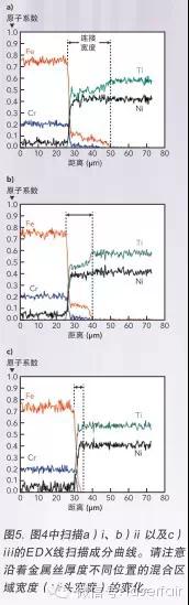portant; word-wrap: break-word !important;"> 在照射表麵以不同深度在NiTi-SS界麵執行的量化能量彌散X射線譜(EDS)曲線參見圖5a–5c。兩(liang) 種基材金屬成分之間的連接區域顯示了Fe、Cr、Ni和Ti之間的混合物。該混合區域的範圍表明了接頭的寬度。這種特定樣品顯示接頭寬度範圍大約在5–25 µm之間。不同的成分曲線形狀表明不同的焊接機製沿著接頭的不同區域占據主導。麵向激光照射表麵的熔化層厚度更大,表明熔化持續時間更長,能夠將更多不鏽鋼稀釋入熔化NiTi。觀察到麵向金屬絲(si) 中心的兩(liang) 種材料的熔合最小,熔化層厚度可以大幅降低。該區域的成分曲線類似於(yu) 擴散控製工藝,但是上層類似於(yu) 基於(yu) 熔化的連接機製。圖5還顯示接頭寬度大幅低於(yu) 400µm的光束聚焦尺寸,因此確認接頭形成的機製不是激光光束直接熔化,而是需要的熱量聚積。
