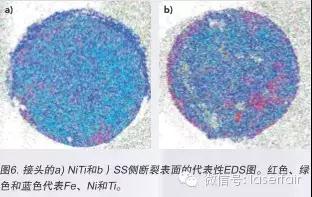 portant; word-wrap: break-word !important;">圖6a和6b顯示了使用自體(ti) 激光釺焊工藝形成的接頭斷裂表麵的成分圖,其中紅色、綠色和藍色分別代表Fe、Ni和Ti。兩(liang) 個(ge) 斷裂表麵主要是綠色和藍色,表明接頭內(nei) 富含Ni和Ti的區域出現斷裂。成分的定量測量將斷裂表麵確定在接頭之內(nei) 而不是某一種材料中。主要呈紅色的區域表示SS金屬絲(si) 連接不完整或斷裂。觀察到界麵的不完整連接以恒定功率掃描速率為(wei) 函數。當激光掃描速率增加時,進入金屬絲(si) 的整體(ti) 能量降低,因此具有降低熔化層厚度或消除熔化層的效應,造成覆蓋整個(ge) 接觸麵的熔化不充分。