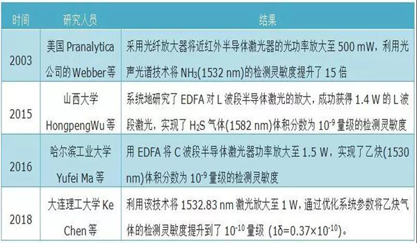 以固體(ti) 激光器和氣體(ti) 激光器為(wei) 代表的大功率激光器的發展,基本上滿足了光聲光譜氣體(ti) 檢測對大功率激勵光源的需求,但研究人員在實際需求中傾(qing) 向於(yu) 使用結構緊湊、成本低、穩定性好的可調諧半導體(ti) 激光器,其中以響應速度快、窄線寬的分布反饋式半導體(ti) 激光器的應用最為(wei) 廣泛,但該類型激光器的輸出功率隻有十幾毫瓦,限製了光聲光譜氣體(ti) 傳(chuan) 感器的性能。