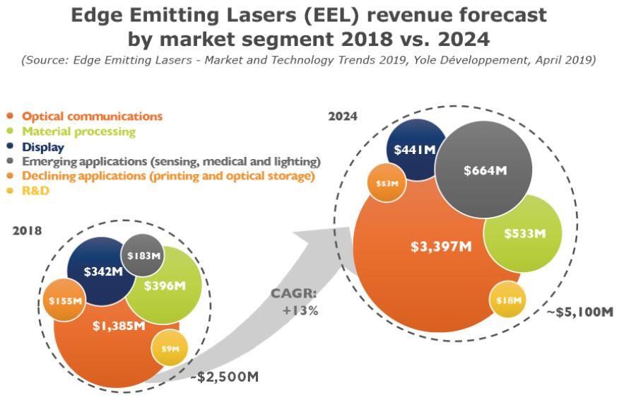 2018年,EEL市場規模為(wei) 25億(yi) 美元,預計2024年將達到51億(yi) 美元,複合年增長率為(wei) 13%。其增長將繼續由光通信領域驅動,例如數據通信和電信光學係統。這些是EEL目前最大的應用領域,占據2018年市場營收的56%。