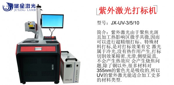 4.紫外激光打標機:紫外激光由於聚焦光斑及小,且加工熱影響區微乎其微,因而可以進行超精細打標、特殊材料打標、是對打標效果有更高要求的客戶首選產品。紫外激光屬於冷光,沒有熱作用產生,達標切割效果精密、光滑、側壁陡直,不會產生熱效應,不會產生燒焦問題,除了銅以外,很多材料對355nm的紫色光是吸收的,所以UV的紫外激光能使和加工更多的材料類型。