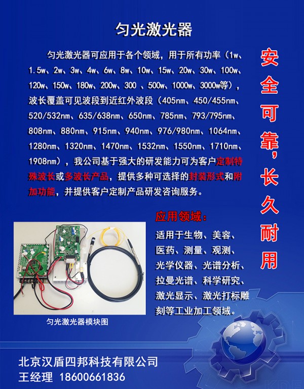 公司介紹:北京漢盾四邦科技有限公司是一家創新型高科技公司,專(zhuan) 注於(yu) 半導體(ti) 激光器係統產(chan) 品應用。十多年來自主潛心專(zhuan) 注於(yu) 光纖耦合輸出半導體(ti) 激光光電領域,技術先進,工藝規範,質量可靠,壽命長久,給各行各業(ye) 、科研院所配套使用多年,享有盛譽。