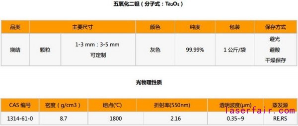 五氧化二鉭是一種完美的高折射率材料,適合用於(yu) 在近UV(紫外)至IR(紅外)區域鍍膜,隻有很少的吸收。在過去的短短的幾年裏,Ta2O5鍍膜材料曆經了很大的成功應用,用在DWDM鍍膜,用於(yu) 結合二氧化矽膜層。五氧化二鉭適用於(yu) 濾光器,高反膜,絕緣膜。