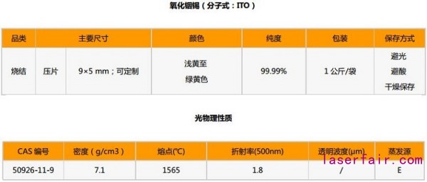 氧化銦錫(ITO)又名摻錫氧化銦。ITO用於(yu) 光學鍍膜,最值得注意的有建築學中紅外線-反射鍍膜(熱鏡)、汽車、還有鈉蒸汽燈玻璃等。別的應用包括氣體(ti) 傳(chuan) 感器、抗反射膜、和用於(yu) VCSEL激光器的布拉格反射器。可以用作透明導電膜,抗靜電膜和日光調節膜。
