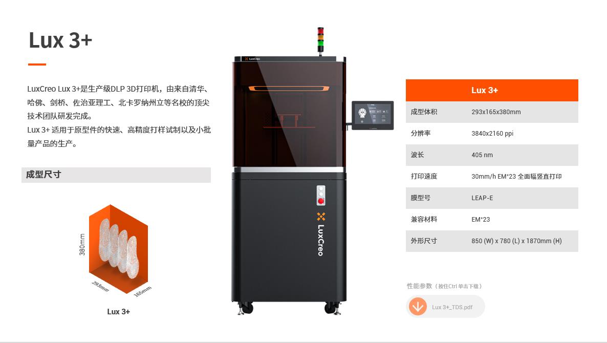 LuxCreo Lux 3+是生產級DLP 3D打印機,由來自清華、哈佛、劍橋、佐治亞理工、北卡羅納州立等名校的頂尖技術團隊研發完成。Lux 3+ 適用於原型件的快速、高精度打樣試製以及小批量產品的生產。