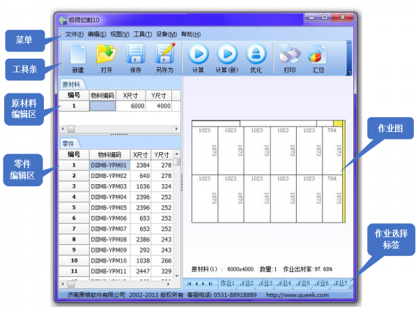 5.高性能、高速度開料算法,材料利用率、餘(yu) 料優(you) 化、切割工作量小化、達到理想水平;