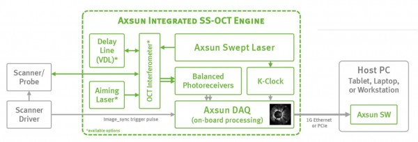 Excelitas提供采集速率高達900MS/s的12位數據采集卡,接口有Gigabit Ethernet或PCIe可選。Axsun集成引擎配備掃頻激光器、k時鍾生成器、平衡探測器以及高速數據采集卡,波長1060nm或1310nm波長,A行掃描頻率50kHz、100kHz或200kHz。