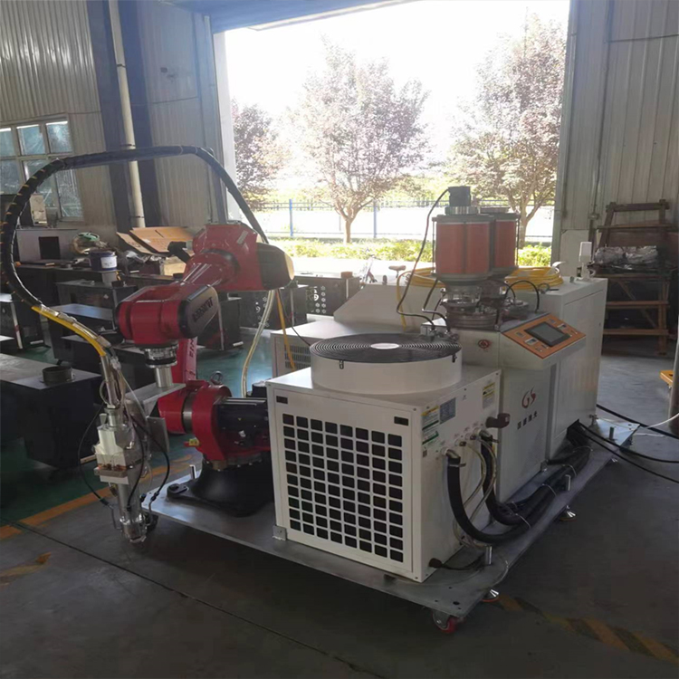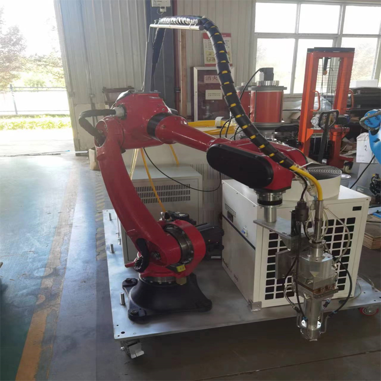 移動式激光熔覆設備主要由前端執行器和後端設備組成。前端執行器由多軸工業(ye) 機器人、移動小車及電氣控製係統、送粉機構、激光熔覆頭和熔覆噴嘴組成。後端設備由高功率光纖激光器、水冷器、電源電箱和保護氣組成。移動式熔覆設備幾乎是大型設備維修現場唯一的維修選擇,尤其是對於(yu) 那些無法拆卸和運輸的部件。