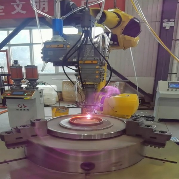 八軸聯動激光熔覆設備,是國盛激光自主研發的以機器人為(wei) 運動核心,可適應各種複雜結構,和非標準零件的激光熔覆加工係統。該係統配置靈活多樣,根據客戶應用場景可配置不同規格的機器人,同時選配變位機、轉台、滑台以適應不同加工類型工件的激光熔覆加工及表麵處理。設備主要由前端執行機構和後端設備組成,前端執行機構包括機械臂、變位機、電氣控製係統、激光熔覆頭、熔覆噴嘴組成;後端設備包括熔覆專(zhuan) 用激光器、熔覆專(zhuan) 用水冷機、穩壓電源、送粉器等。