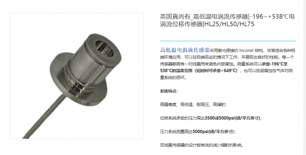當然,並不是所有的電渦流傳(chuan) 感器都可以用於(yu) 高溫環境應用,因為(wei) 通用的電渦流傳(chuan) 感器通常的最高工作溫度是100多度,即使是英國真尚有的ZED23係列寬溫型電渦流傳(chuan) 感器最高也隻能到200℃。要是測量環境溫度高於(yu) 200℃,就必須選擇耐更高溫度的專(zhuan) 用版本,比如英國真尚有的高低溫電渦流傳(chuan) 感器HL係列。