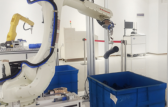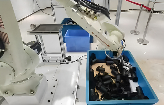 膠管無序擺放在料框中,3D視覺對工件進行識別和定位,引導機器人實現對膠管的無序抓取並上料,用機械臂替代人工,抓取精度±0.25mm,可24小時穩定運行。