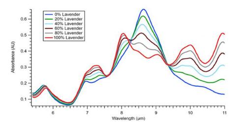 Ocean MZ5測量了用杏仁油(一種普通摻釋物)稀釋的薰衣草油樣品的一係列吸收光譜,光譜差異揭示了濃度相關(guan) 差異。光譜數據再使用化學計量分析可以獲得更多額外信息。
