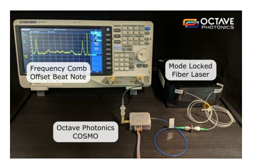 偏移檢測示例:在上圖配置中,COSMO連接到Er:光纖激光器的輸出端。 射頻頻譜分析儀(yi) 顯示三個(ge) 峰值:fCEO、fCEO – frep 和 frep,其中 frep 是激光重複率。