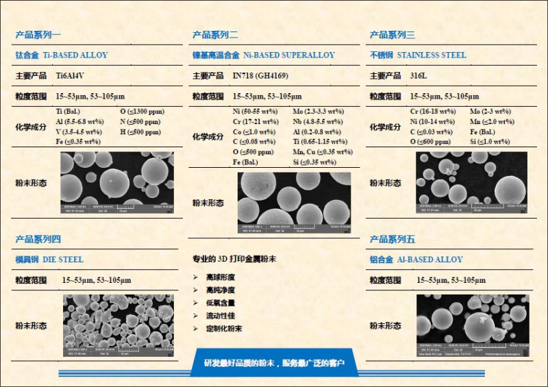 本公司專(zhuan) 供用於(yu) 3D打印的Ti合金粉末、Ni合金粉末、不鏽鋼粉末、模具鋼粉末、鋁合金粉末等多種金屬耗材。