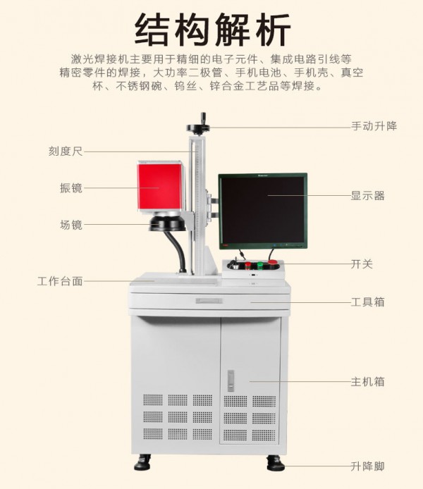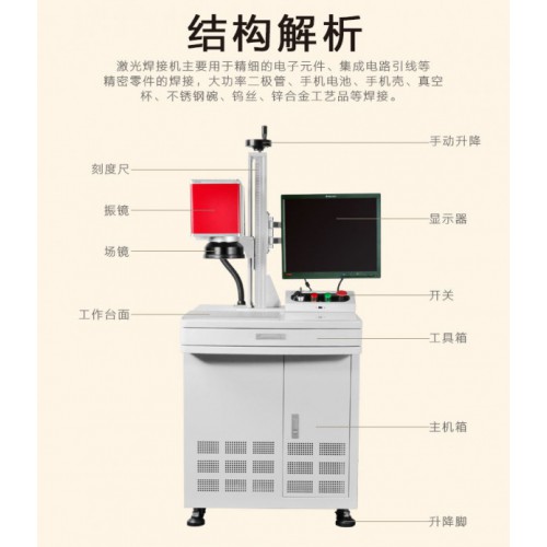 采用振鏡掃描和焊接係統相結合,焊接速度快,特別適用各種小型薄壁零部件的激光精密點焊,生產(chan) 效率比普通激光點焊高,振鏡與(yu) 激光均由軟件直接控製,提供基於(yu) windows xp平台下的專(zhuan) 用激光焊接軟件。焊接點或圖形可在其專(zhuan) 用軟件中直接輸入、編輯、也可由autoCAD、coreldraw等其它軟件編輯,也可導入DWG或PLT文件,本機質量穩定,操作方便,維護簡單。