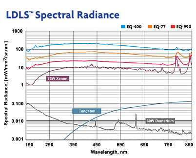 ENERGETIQ光源是一款高亮度、高穩定、長壽命的寬譜光源,其采用革命性的光源技術—— LDLS ™激光驅動光源技術,利用連續激光直接加熱氙離子至需要的溫度,以產(chan) 生高效的寬頻譜光。該產(chan) 品具有很寬的光譜範圍,譜線包括軟 X 射線(SXR),遠紫外線(EUV), 深紫外線(DUV), 並覆蓋從(cong) 可見光到紅外光區(IR),波長範圍從(cong) 170nm到2100nm以上。無電極的LDLS技術可以產(chan) 生小體(ti) 積高亮度的等離子體(ti) ,實現高效的集光和從(cong) 深紫外到可見光甚至更長波段的寬光譜,並且延長了燈的使用壽命。